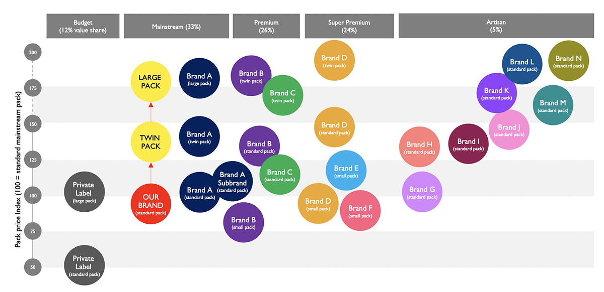 It’s helpful to map out the competition visually to see how crowded each space is, and if any gaps are revealed. The diagram below provides an indication of who the competition is and where they sit in terms of a price ladder (in practice, we’d look at a much broader data set across more dimensions but I’m trying to avoid this article becoming a thesis). At the bottom of the ladder are Private Label brands, which sell at a 50% discount to the mainstream average (indexed at 100 on the vertical scale). At the top of the ladder are artisanal brands in standard size packs, mainstream brands in large formats and premium/super premium brands in twin packs.