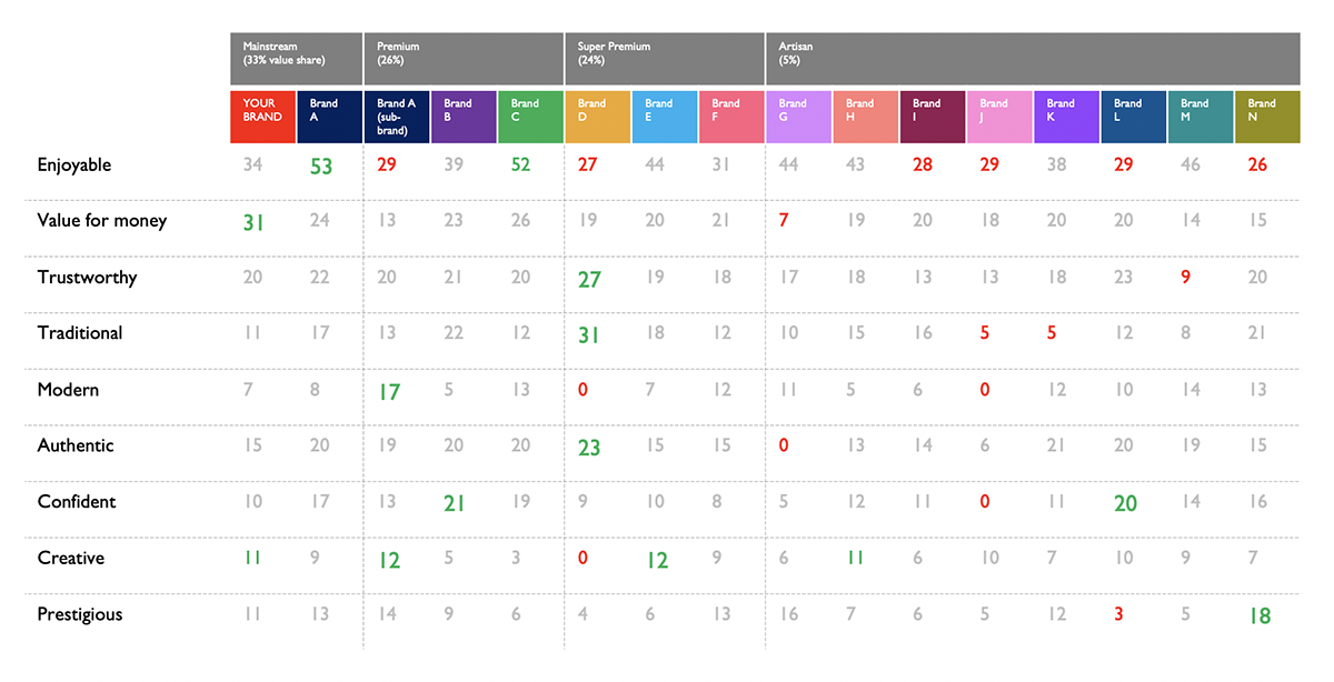 One obvious point to note is that there are few genuinely strong brands in the category: Brands A and C have strong associations with enjoyment, but beyond this most image associations are weak. This isn’t good news for a category that’s worried about the threat of Private Label brands. Our brand trades heavily on value for money associations, so our client’s concern about this threat is well-grounded. But this is also likely to limit our ability to compete in premium and super premium segments of the market, where the leading brands rely more on emotive attributes, such as enjoyment, tradition, modernity and authenticity. Our brand is too weak to compete on those terms, so we’d either need to reposition our brand (away from value) to be able to stretch into more premium spaces, or we’d need to create an entirely new brand to compete in these spaces. There’s very little in the data to suggest that our brand has any chance of stretching successfully into premium segments.