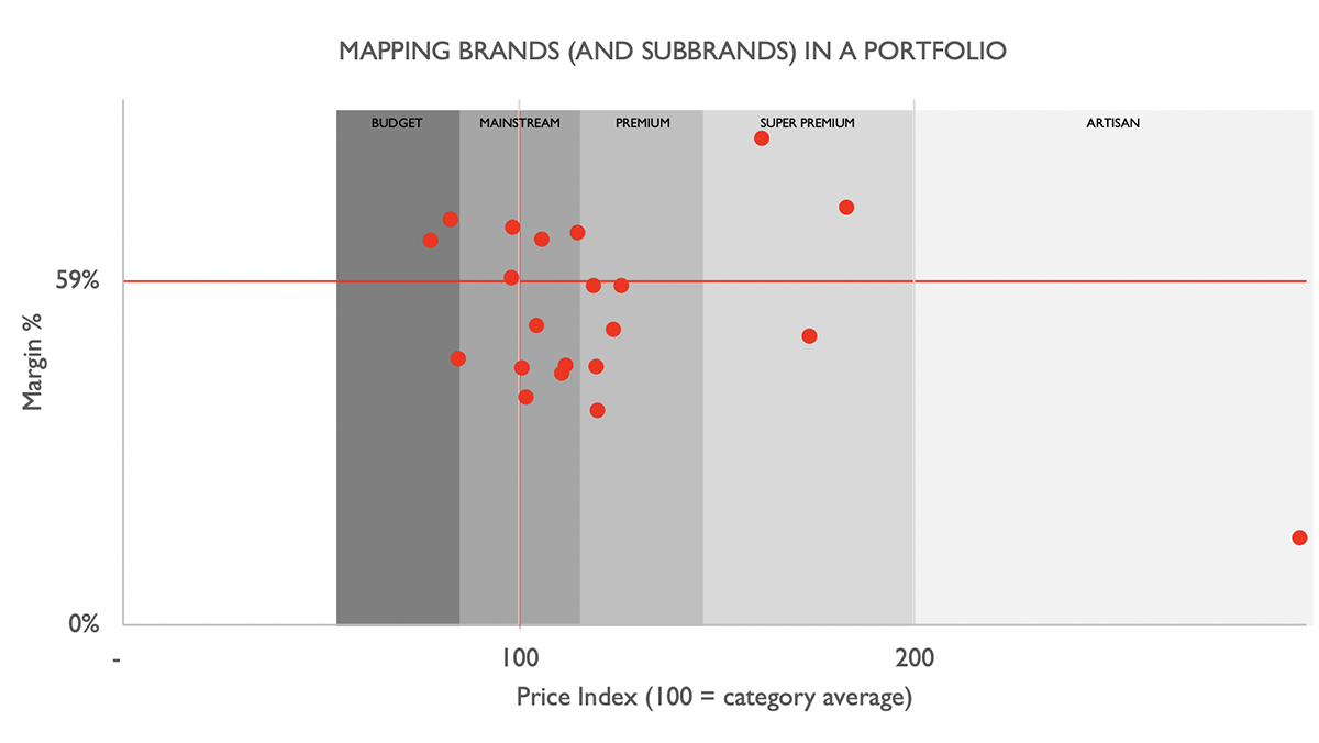 And that’s what explains the solitary red dot at the bottom right of the previous chart: it belongs to a small, artisanal pilot brand. The intention is not to try to find a formula for immediate success in the premium space, but to learn by managing a brand at the extreme end of the category. It sells through a channel that the business has no prior experience of (direct-to-consumer). It’s reaching an audience that the business has never traditionally interacted with. And it’s enabling the business to work with suppliers and partners that it wouldn’t normally deal with. Everything the business learns will eventually inform a better and more profitable approach to unlocking premium opportunities.