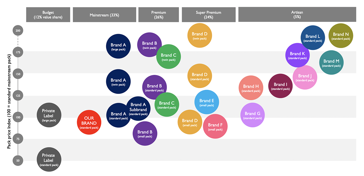 It’s helpful to map out the competition visually to see how crowded each space is, and if any gaps are revealed. The diagram below provides an indication of who the competition is and where they sit in terms of a price ladder (in practice, we’d look at a much broader data set across more dimensions but I’m trying to avoid this article becoming a thesis). At the bottom of the ladder are Private Label brands, which sell at a 50% discount to the mainstream average (indexed at 100 on the vertical scale). At the top of the ladder are artisanal brands in standard size packs, mainstream brands in large formats and premium/super premium brands in twin packs.
