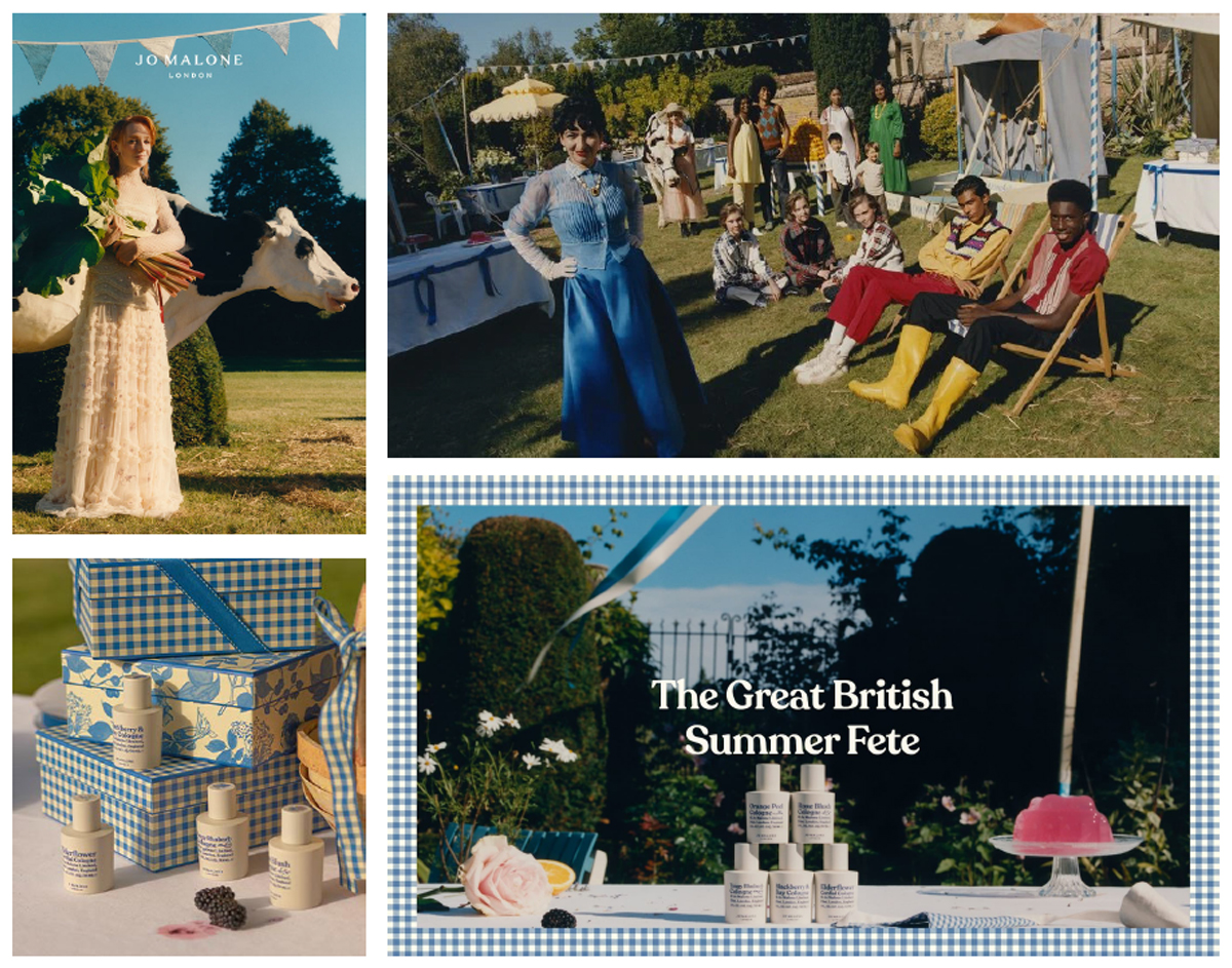 We see Jo Malone immersing us in the atmosphere of summer in the form of the fete – they use blue and white gingham, classic imagery of bunting, and cakes and jellies – aside from a nod to Gucci with a few eccentricities (wellies, cows) it otherwise a straight evocation of a Summer moment.